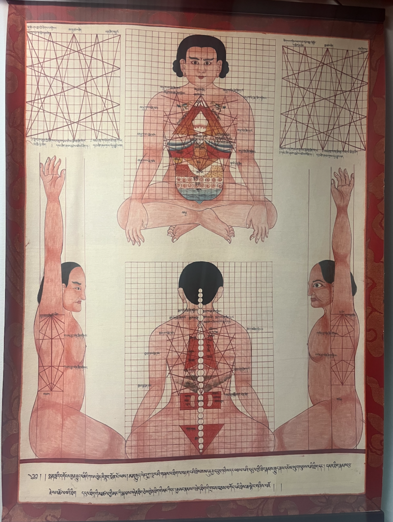 In the clinic, different illustrations and diagrams for understanding the body according to Tibetan medical theory are hung on the walls. One diagram, for example, maps the physiological location of the five elements, which are earth, water, fire, wind, and space, along with sites for moxibustion therapy (Fig. 5). In addition to the five elements, Tibetan physicians diagnose disease according to the three humors of wind (rlung), bile (mkhris pa), and phlegm (bad kan).